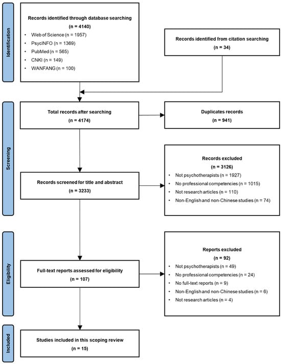 A comprehensive literature search was performed to retrieve articles from five databases up to 28 March 2023. Specifically, the databases searched included Web of Science, PsycINFO, PubMed, WANFANG, and China National Knowledge Infrastructure (CNKI). The latter two databases were specifically utilized for identifying Chinese-language articles. Two categories of keywords, namely, “counselors” and “competencies”, were used to search potential articles. The terms related to counselors were “therapist*”, “counselor*”, and “psychotherapist*”. The terms related to competency were “professional competenc*”, “capabilit*”, and “therapeutic competenc*”. Note that the asterisk symbol “*” serves as a wildcard character in this context. The selection of the final terms resulted from a balance between the pursuit of comprehensiveness and the necessity to maintain relevance. This process was undertaken during the preliminary search phase. The researchers logged in to the websites and used their advanced search functions, which support the use of various search strategies combining different terms. More detail on the search strategy for each of the five databases is available in the Supplementary Materials. Following the database searches, the reference lists of the identified literature were systematically reviewed and analyzed.