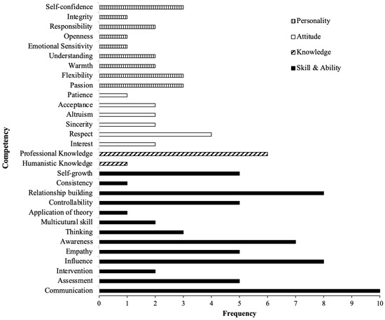 The frequencies of 30 competencies observed in the included articles are shown in Figure 2. Communication emerged as the most emphasized competency, being discussed in 10 articles. Relationship building and influence, with equal frequencies, were discussed at the second highest rate. On the other hand, integrity, openness, emotional sensitivity, patience, humanistic knowledge, consistency, and application of theory received the least attention, being mentioned in only one of the reviewed articles.
