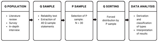 This approach is especially effective for objectively and practically studying diverse viewpoints, providing a deeper understanding of unique individual perspectives (Y. C. Kim & Lee, 2020). Its flexibility and precision make it an indispensable tool for researchers across various fields. The research procedure for Q methodology comprises five steps: constructing the Q population, selecting the Q sample, selecting the P sample, Q sorting and data analysis. Figure 1 illustrates these steps (Brown, 1980).