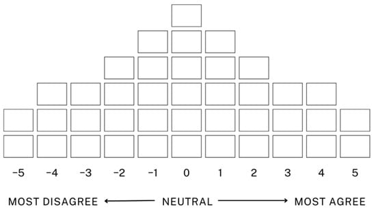 The forced distribution method requires participants to sort statements into a predetermined distribution, systematically ranking each statement according to their level of agreement. This process quantifies each participant’s unique perceptions and allows researchers to identify differences in perceptions during data analysis. This study used a scale ranging from −5 to +5 to highlight the statements with which participants most agreed and disagreed. This approach is particularly useful for capturing the intensity of subjective perceptions in greater detail. Additionally, the forced distribution method in Q sorting enables participants to express their perspectives and provides the foundation for factor analysis, which identifies the major perception types among participants (J. H. Yoon et al., 2024; J. S. Kim et al., 2023). This analysis provides a structured understanding of humanities job seekers’ challenges and needs during their employment preparation process.
