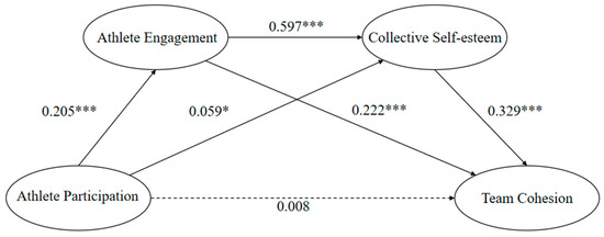 Path analysis of the mediating effects of athlete engagement and collective self-esteem on team cohesion. *: p < 0.05; ***: p < 0.001.