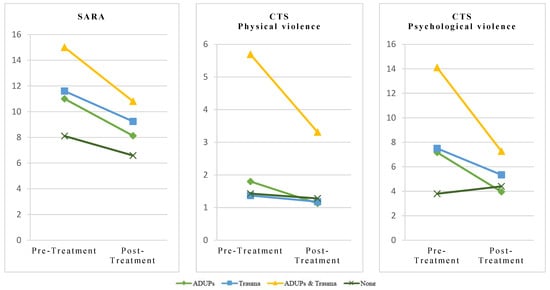 Table 3 displays the descriptive statistics for each group of variables analyzed at pre-intervention. The results indicated a significant difference between groups in the risk of IPV recidivism (F1, 294 = 33.1, p < 0.001, η2p = 0.26), self-reported physical violence (F1, 308 = 6.51, p < 0.001, η2p = 0.06), and psychological violence (F1, 309 = 7.05, p < 0.001, η2p = 0.07). Specifically, participants in the ADUPs and trauma group exhibited a greater risk of IPV recidivism and self-reported physical violence compared to those in the Trauma (ΔM = 2.79, p = 0.004; ΔM = 4.06, p = 0.002, respectively), ADUPs (ΔM = 3.92, p < 0.001; ΔM = 3.33, p = 0.008; respectively), and None (ΔM = 6.75, p < 0.001; ΔM = 3.96, p < 0.001, respectively) groups. Additionally, these participants reported higher rates of psychological violence when compared to those in the ADUPs (ΔM = 4.36, p = 0.040), and None (ΔM = 7.08, p < 0.001) groups. Furthermore, participants in the ADUPs group and Trauma group exhibited a greater risk of IPV recidivism compared to those in the None group (ΔM = 2.83, p < 0.001; ΔM = 2.83, p < 0.001, respectively). No statistically significant differences were obtained for the remaining comparisons (p > 0.05).