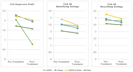Table 3 presents the descriptive statistics for each group of the variables under examination at pre-intervention. The findings showed a significant difference in depressive symptomatology (F1, 310 = 6.67, p < 0.001, η2p = 0.06), difficulties in identifying and describing feelings (F1, 310 = 8.01, p < 0.001, η2p = 0.07; F1, 310 = 4.55, p = 0.004, η2p = 0.04, respectively), anxiety (F1, 290 = 13.7, p < 0.001, η2p = 0.13), dysthymia (F1, 290 = 10.1, p < 0.001, η2p = 0.09), and post-traumatic stress (F1, 290 = 18.8, p < 0.001, η2p = 0.16) between the groups. In particular, participants in the ADUPs and trauma group exhibited higher levels of depressive symptomatology (ΔM = 0.53, p < 0.001), difficulties in identifying and describing feelings (ΔM = 0.91, p < 0.001; ΔM = 0.69, p = 0.001, respectively), anxiety (ΔM = 33.7, p < 0.001), dysthymia (ΔM = 24.4, p < 0.001), and post-traumatic stress (ΔM = 31.7, p < 0.001), when compared to participants in the None group. Additionally, these participants presented greater difficulties in identifying feelings (ΔM = 0.21, p = 0.035) and anxiety levels (ΔM = 17.6, p = 0.024), when compared to those in the Trauma group, and higher prevalence of dysthymia and post-traumatic stress (ΔM = 12.5, p = 0.045; ΔM = 14.7, p = 0.009, respectively), when compared to those in the ADUPs group. Finally, participants in both the ADUPs group and Trauma group exhibited greater levels of depressive symptomatology (ΔM = 0.35, p = 0.023; ΔM = 0.40, p = 0.014; respectively), anxiety (ΔM = 18.9, p = 0.001; ΔM = 16.1, p = 0.021; respectively), dysthymia (ΔM = 11.8, p = 0.026; ΔM = 11.9, p = 0.049; respectively), and post-traumatic stress (ΔM = 17.0, p < 0.001; ΔM = 18.9, p < 0.001; respectively), when compared to those in the None group. The remaining comparisons yielded no statistically significant results (p > 0.05).