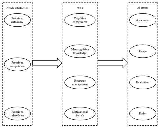 The research mentioned above has provided sufficient evidence to suggest there might be a relationship between university students’ need satisfaction and self-regulated learning strategies, and between self-regulated learning strategies and artificial intelligence literacy. This study seeks to examine the relationships between the three models and investigate whether stronger empirical connections exist between them at the dimensional level. Based on this, we propose the following hypotheses and present the research model, as illustrated in Figure 1.