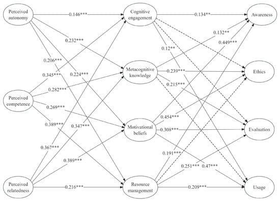 As shown in Table 4, regarding the relationship between need satisfaction and AI literacy, this study finds that perceived autonomy has a direct positive effect on cognitive engagement (β = 0.146, p < 0.001), metacognitive knowledge (β = 0.232, p < 0.001), motivational beliefs (β = 0.224, p < 0.001), and resource management (β = 0.206, p < 0.001). Similarly, perceived competence is found to have a direct positive effect on cognitive engagement (β = 0.345, p < 0.001), metacognitive knowledge (β = 0.282, p < 0.001), motivational beliefs (β = 0.269, p < 0.001), and resource management (β = 0.389, p < 0.001). Additionally, perceived relatedness has a direct positive effect on cognitive engagement (β = 0.367, p < 0.001), metacognitive knowledge (β = 0.347, p < 0.001), motivational beliefs (β = 0.389, p < 0.001), and resource management (β = 0.216, p < 0.001). Regarding the relationship between SRLSs and AI literacy, the evaluation results indicate that cognitive engagement significantly impacts awareness (β = 0.134, p < 0.01) and usage (β = 0.12, p < 0.01). However, its direct impact on ethics and evaluation is not significant. Metacognitive knowledge has a significant positive effect on awareness (β = 0.132, p < 0.01), ethics (β = 0.239, p < 0.001), and evaluation (β = 0.215, p < 0.001), whereas cognitive engagement does not significantly influence usage. Motivational beliefs have a significant positive impact on AI literacy, including awareness (β = 0.449, p < 0.001), ethics (β = 0.454, p < 0.001), evaluation (β = 0.308, p < 0.001), and usage (β = 0.47, p < 0.001). Resource management has a significant positive effect on awareness (β = 0.191, p < 0.01), usage (β = 0.209, p < 0.001), and evaluation (β = 0.251, p < 0.001), whereas cognitive engagement does not significantly influence ethics.
