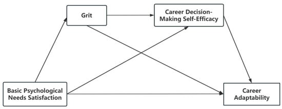 In summary, this study explores the relationship between basic psychological needs satisfaction and career adaptability among university students, with grit and career decision-making self-efficacy playing multiple mediating roles (see Figure 1).