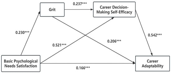 The mediation effect test was conducted using Model 6 in PROCESS, and the results are presented in Table 2. The results indicate that university students’ basic psychological needs satisfaction significantly and positively predicts grit, career decision-making self-efficacy, and career adaptability. Specifically, basic psychological needs satisfaction significantly and positively predicts grit (β = 0.230, 95% CI [0.101, 0.201]), career decision-making self-efficacy (β = 0.521, 95% CI [1.30, 1.657]), and career adaptability (β = 0.166, 95% CI [0.159, 0.353]) among university students. Grit significantly and positively predicts career decision-making self-efficacy (β = 0.237, 95% CI [0.752, 1.297]) and career adaptability (β = 0.206, 95% CI [0.353, 0.612]). Career decision-making self-efficacy significantly and positively predicts career adaptability (β = 0.542, 95% CI [0.259, 0.33]). Therefore, when both grit and career decision-making self-efficacy are included in the regression equation, basic psychological needs satisfaction still has a significant and positive predictive effect on career adaptability.