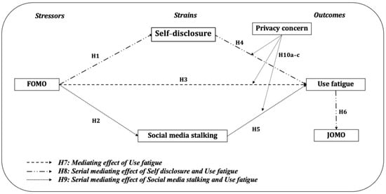 In contrast, social media stalking involves the passive observation of others’ social media activities to alleviate the FOMO or anxiety. While both behaviors are related to fatigue, self-disclosure typically aims to enhance social interaction, whereas social media stalking serves as a coping mechanism to reduce feelings of missing out, without the intention of direct social engagement. Specifically, social media stalking, driven by the FOMO, leads to overexposure to content, resulting in information overload, emotional exhaustion, and usage fatigue (Dhir et al., 2018). This behavior can eventually propel users toward the JOMO as a self-protective response, where they reduce online stress in favor of offline relaxation (Tandoc et al., 2015). Therefore, we propose the following: