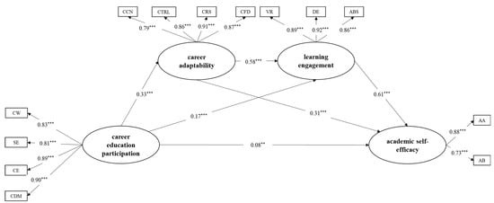 The results of the descriptive analysis and correlation tests are summarized in Table 1. Significant associations were found between career education participation and career adaptability (r = 0.31, p < 0.001), learning engagement (r = 0.34, p < 0.001), and academic self-efficacy (r = 0.34, p < 0.001). Additionally, career adaptability was positively correlated with both learning engagement (r = 0.59, p < 0.001) and academic self-efficacy (r = 0.63, p < 0.001). Furthermore, learning engagement was found to be significantly related to academic self-efficacy (r = 0.72, p < 0.001). These significant relationships among the primary variables provide empirical support for the proposed sequential mediation model.