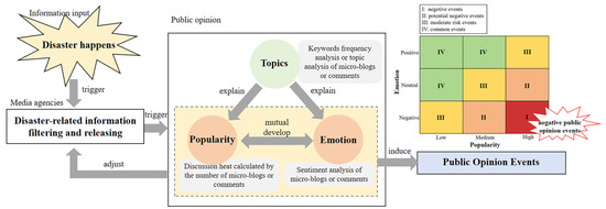 Based on the above findings, an analytical framework for analyzing online public opinion is summarized in Figure 1. When disasters happen, the media agencies filter and release disaster-related information to the public, causing the public to express their opinions, which are shaped by three characteristics, namely, discussion topics, popularity, and emotion. Here, the public’s topics of concern are usually acquired through the methods of keywords frequency analysis or topic analysis. Topic popularity refers to the discussion’s heat and is usually calculated via the number of topic-related micro-blogs or public comments. As for the public’s emotions, these are the emotions expressed in micro-blogs or comments, which can be calculated via sentiment dictionary methods or machine learning. According to previous research, the two factors of popularity and emotion influence each other and develop together, and the topic factor acts as the explanation of the former two factors during the analysis of public opinion. By monitoring the development of these three factors, media agencies can learn the current state of public opinion in time and adjust their subsequent information release strategy accordingly.