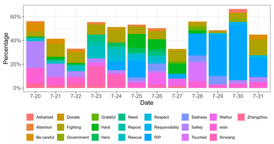 In general, the temporal changes of these keywords were roughly consistent with the development of the rainstorm disaster. On 20 July, when the rainstorm suddenly broke out in the city of Zhengzhou, the public was more likely to express their concern, as well as wishes and encouragement for the victims’ safety, resulting in the keywords “safety”, “wish”, “be careful”, and “fighting” ranking as the top four over the following two days. After that, the frequency of keyword “rescue” increased continuously until 25 July, indicating that people diverted their attention to the actual rescue progress. At the same time, the ranking of “Zhengzhou” declined while “Xinxiang” and “Weihui” increased, which reflected that the rainstorm had moved from the city of Zhengzhou to the city of Xinxiang. On 23 and 24 July in particular, the keywords “rescue”, “repost”, “need”, and “donate” accounted for a large proportion of people’s discussion, implying that the rescue had reached a critical stage and information on the rescue’s progress and the need for relief materials were being widely spread.