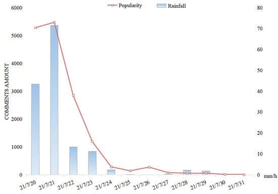 The daily popularity changes of micro-blogs concerning the rainstorm are shown in Figure 3. The vertical axis measures the total number of comments, indicating the popularity of micro-blogs. The popularity was at a relatively high level on 20 July and reached the highest point on 21 July. After that, the heat of the discussion gradually decreased over time, which was largely consistent with the evolution of the rainfall. Taking into account people’s topics of concern in Figure 2, and that the event-related keywords “Zhengzhou”, “rescue” and “trapped” ranked high on 20 and 21 July, this significant peak was mainly due to the heated discussion of the severe Zhengzhou Metro incident caused by the rainstorm.