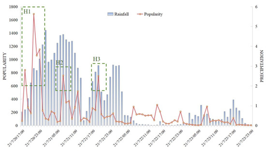 In order to further examine the popularity changes when the popularity was at a relatively high level, the number of comments from 20 to 23 July is specifically analyzed in Figure 4 and Table 1. It is shown that the hourly popularity changes did not fit as well with the precipitation as did the daily popularity data, especially for the period of midnight. Here, we used the one-third and two-thirds values of the popularity peak as the criteria of high and medium levels of popularity. Accordingly, three peaks were determined (peaks within two hours were considered as the same peak). Referring to people’s topics of concern in Figure 2, the first and the highest popularity peak, which lasted from 18:00 until 23:00 on 20 July, could be attributed to the Zhengzhou Metro incident, which aroused strong concern and heated discussion on both the situation and the progress of the rescue operation.