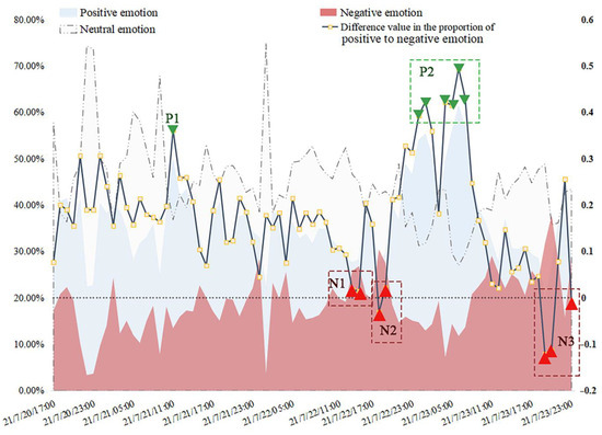The sentiment polarities of people’s micro-blog comments were analyzed, and the daily proportions of positive, negative, and neutral comments are shown in Figure 5. The differences between the positive and negative proportions were calculated to represent the general state of people’s emotion. The larger the difference value, the more positive the public’s emotion. On the whole, the difference value stayed over 0%, indicating that positive comments occupied dominant positions in the early stages before 27 July compared with negative comments. At the beginning of the disaster, when the incident of Zhengzhou Metro happened, the difference value was at its highest point, which could be due to the public’s encouragement for the affected victims, as Figure 2 shows.