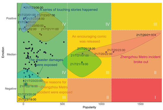 Using the same popularity and emotion criteria as described in Section 3.1, all the public opinion events could be classified into nine types, which are shown in Figure 7. In the process of public opinion monitoring, events with the characteristics of low or medium popularity and positive or neutral emotion (area IV in Figure 7) are in a normal condition, which do not require attention. On the contrary, conditions with high popularity and negative emotion (area I in Figure 7), which are recognized as negative public opinion events, should be avoided if possible. Therefore, the patterns of this event type need to be recognized in time in order to avoid negative public opinion events and create a favorable environment for public opinion. In the case of the 7.20 Henan rainstorm, it was found that no negative public opinion conditions appeared. However, we can still learn the public opinion patterns from other events that have high popularity or negative emotions.