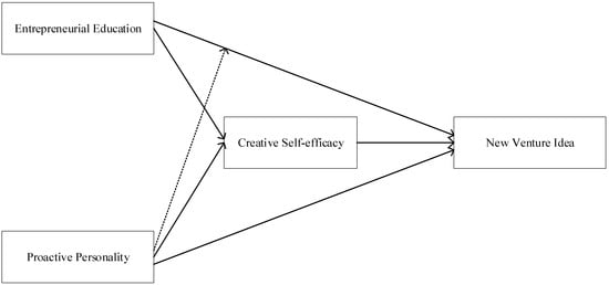Social cognitive theory holds that human activities are determined by the interaction of three factors: individual behavior, individual cognition and other individual characteristics, and the external environment in which the individual is located (). Proactiveness, as one of the core characteristics of personality agency (), can directly influence individual behavior and also interact with the environment to jointly influence individual behavior. Universities are important environmental factors that influencing undergraduates to engage in entrepreneurial activities, where the innovation atmosphere, entrepreneurial courses, and various entrepreneurial support are all components of entrepreneurial education (). Therefore, proactive personality may not only directly affect the formation of undergraduates’ NVIs, but also interact with entrepreneurial education, the environment where undergraduates are located, to affect the formation of their NVIs. In addition, the core concept of social cognitive theory is self-efficacy, which refers to an individual’s subjective perception of their belief and ability to complete a specific activity (). Individuals with high-level self-efficacy can generate novel and useful ideas through intrinsic drive (). () believes that self-efficacy originates from mastery experiences, vicarious experiences, social persuasion, and somatic and emotional states, so undergraduates’ self-efficacy can be enhanced through entrepreneurial education. Therefore, as a self-efficacy in the field of creative activities (), creative self-efficacy may play an important role in the influence of entrepreneurial education on the formation of new venture ideas.