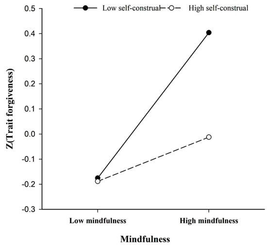 The interaction was further investigated using the procedures of () by analyzing simple slopes for the two respects self-construal and plotting them. At low levels of the self-construal index, specifically interdependent self-construal, mindfulness was significantly positively related to trait forgiveness (β = 0.30, t = 4.16, p < 0.001). While this association was not significant at high levels of the self-construal index, specifically independent self-construal (β = 0.09, t = 1.23, p > 0.05) (Figure 1).