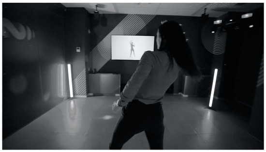 The participant engaged in the ‘Energy’ exercise program within the ‘My Flow’ concept room. The image showcases a female participant performing aerobic-based exercises in a dark room specifically designed to enhance the sensory experience with curated light and sound stimuli.