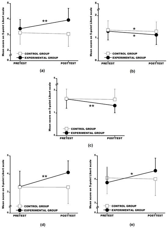 Main effects of time, F(1, 82) = 8.94, p < 0.01, η2 = 0.10, and interaction effects, F(1, 82) = 12.29, p < 0.01, η2 = 0.13, were identified (Figure 2e). Post hoc tests (Sidak) revealed no significant differences between groups at the pretest, but significant improvements were noted at the posttest for the experimental group (p < 0.05). Additionally, within-group comparisons demonstrated a significant increase in emotional arousal of work motivation for the experimental group from pretest to posttest (p < 0.05), with no significant changes in the control group.
