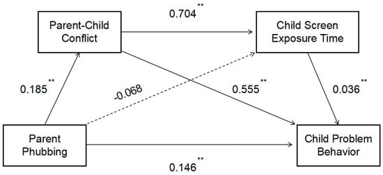 According to the regression analysis validity test results, parent phubbing directly predicted preschool children’s problem behaviors (β = 0.148, p < 0.01), indicating a significant direct effect, so hypothesis H1 was supported by the empirical findings. Parent phubbing significantly predicted parent–child conflict (β = 0.175, p < 0.01). Parent–child conflict significantly affected child screen exposure time (β = 0.584, p < 0.01). Both parent–child conflict (β = 0.562, p < 0.01) and child screen exposure time (β = 0.036, p < 0.01) significantly affect preschool children’s problem behaviors. See Table 4.