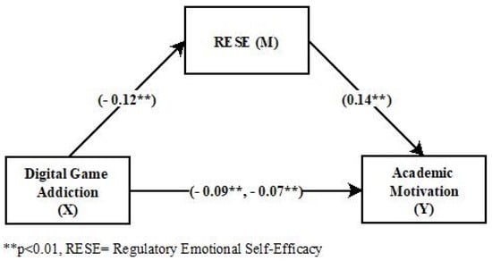 The indirect effect (a.b.) of digital game addiction (X) on academic motivation (Y) in adolescents, through RESE (M), is significantly negative.