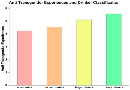 Figure 1 depicts the relationship between anti-transgender experiences and alcohol use classification. As the figure clearly shows, the more anti-transgender experiences people had incurred during the previous year, the more likely they were to engage in heavy drinking. Nondrinkers reported the fewest anti-transgender experiences with discrimination, harassment, and violence (mean = 4.23, SD = 3.39), followed by normal drinkers (mean = 4.55, SD = 3.40), binge drinkers (mean = 5.08, SD = 3.49), and heavy drinkers (mean = 5.52, SD = 3.83). This relationship was statistically significant (p < 0.0001).