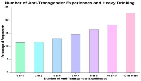 In light of the research focusing on minority stress and adverse outcomes and the research focusing on allostatic load and adverse outcomes, it is not surprising that a number of studies have examined substance misuse/abuse, particularly alcohol misuse/abuse, among transgender individuals. Almost all of these studies have reported much higher-than-average rates of drinking-related problems and unhealthy drinking practices among transgender persons than among other groups in the population at large. For example, () found that 35.4% of the 181 transgender and gender-diverse people in their study reported hazardous drinking levels during the previous six months. () conducted a review of the literature examining binge drinking among transgender and gender-diverse youth aged 10–24. They found that anywhere from 11 to 59% reported binge drinking. Of relevance to the present study, () found that, in general, increased exposure to victimization was associated with an increased risk of binge drinking. As another example, () conducted a study of 2324 transgender and nonbinary Canadians. They discovered that 16.9% of their study participants reported past-year hazardous alcohol drinking. Moreover, the amount of lifetime anti-transgender discrimination (OR = 1.37) and the amount of lifetime major discrimination (OR = 1.69) were both associated with an increased risk of hazardous alcohol drinking. In a study comparing transgender (n = 58) and nontransgender (n = 482) active-duty members of the military, transgender persons were 1.48 times more likely to engage in hazardous drinking (). An even greater prevalence was reported by (). Their study of 452 Massachusetts adults who self-identified as transgender or gender-nonconforming found a 40.9% hazardous drinking rate. () used data from the 2015 National Transgender Survey and examined both binge drinking and frequent binge drinking. They reported that 24.3% of the respondents had engaged in binge drinking during the previous month, with more than one-third of those individuals qualifying as frequent binge drinkers. () went on to point out that antitransgender experiences were associated with an increased risk of engaging both in binge drinking and frequent binge drinking. Also relying on data from the 2015 National Transgender Survey, () found that 40.1% of all current drinkers reported past-month binge drinking. Experiencing any anti-transgender problems elevated the risk of binge drinking by 48%; experiencing many such problems elevated this risk by 104%. Similarly, a three-site study of 330 transgender adults () found that higher levels of “enacted stigma” (i.e., actual anti-transgender experiences, not anti-transgender experiences merely perceived to be based on discrimination) were linked with persistent risky drinking. () reported on a study of 89 American and Canadian transgender and gender-diverse women. They found that anywhere from 39% to 51% of the study participants met the criteria for hazardous drinking, depending on whether a laxer or more restrictive definition of hazardous drinking was applied. In their study, the likelihood of engaging in hazardous drinking increased based on the number of symptoms of trauma that people experienced (more symptoms = heightened risk of hazardous drinking). Based on a sample of 297 transgender, nonbinary, and agender adults, () found that 16.6% met the World Health Organization criteria for problematic alcohol use. All four of the categories of anti-transgender experiences studied were related to problematic alcohol use, but the associations were not strong ones. The authors noted that their findings provided support—but not overwhelmingly strong support—for the notion of minority stress having an impact on problematic alcohol use. ’s () study of 317 transgender adults aged 18–44 found that 18% reported hazardous drinking or harmful alcohol consumption, and 16% reported heavy episodic drinking (i.e., binge drinking). In a qualitative study of 19 African American transgender women from the Washington, DC, and Baltimore areas, () reported that 73.7% of the respondents reported misusing alcohol in response to a violent or traumatic anti-transgender event. () went on to note that participants “used alcohol, tobacco, and other drugs immediately after exposure to violence and beyond to manage stress-related symptoms and unwanted emotions, such as depressed mood, intrusive thoughts, and disordered sleeping”. In one of the only studies identified by the present authors that specifically examined heavy drinking, () found that, of 1096 American transgender adults in their research, 8.5% reported regular heavy drinking and 8.6% reported binge drinking.