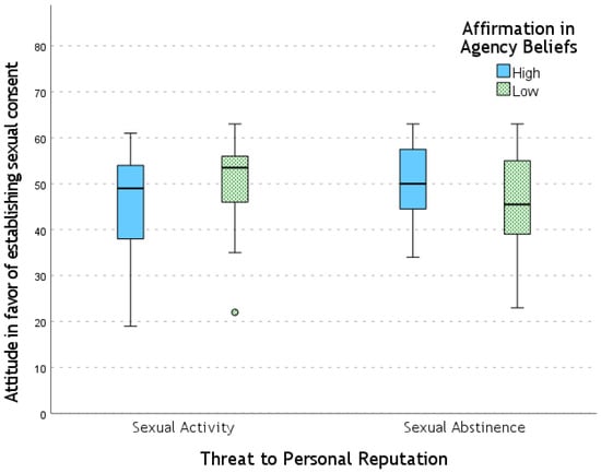 Finally, we found an interaction effect between the manipulated factors on attitude in favor of establishing sexual consent (H5). Specifically, attitudes toward sexual consent were more favorable when personal reputation was threatened due to sexual activity compared to abstinence but only when participants were reaffirmed in low-agency beliefs. Similarly, attitudes toward sexual consent were more favorable when participants affirmed low-agency beliefs (vs. high-agency beliefs) only if their personal reputation was threatened or devalued due to sexual activity.