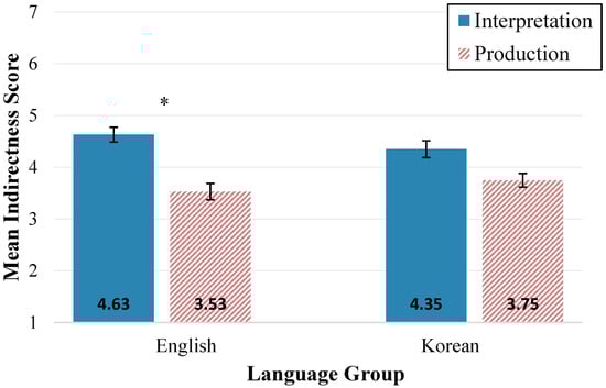 With respect to the first objective, we hypothesized that conversational indirectness would be higher in the Korean group compared to the American group. However, we did not find support for an overall group difference. Instead, we found a group by mode interaction, which showed that higher scores for indirectness characterized the interpretation mode relative to the production mode, but this effect was restricted to the English L1 group. Korean L1 participants did not show a significant difference between communication modes.
