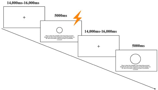 During the habituation and acquisition phases, each trial adhered to a specified sequence: Initially, a red “+” is displayed at the center of the screen for a duration ranging from 14 to 16 s. Subsequently, the CS stimulus and detection interface are presented simultaneously, during which participants are instructed to evaluate the likelihood of the US using a numeric keypad. The CS stimulus remains visible for a maximum of 5 s, irrespective of whether the participants respond. If the stimulus image was linked to the US, an electric stimulus was triggered 200 ms prior to the image’s disappearance; thereafter, both the stimulus image and the US disappeared concurrently. The presentation process for the experimental stimuli is illustrated in Figure 1.