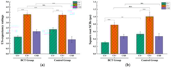 (a) US-expectancy ratings of different experiment groups; (b) SCRs of different experiment groups. The interaction effect between the group and stimulus materials on the SCRs is not significant. ** p < 0.01, *** p < 0.001. Bars represent the standard error of the mean. m.s. represents the marginal significance of the difference (p < 0.10), and n.s. represents no significant difference (p > 0.05).