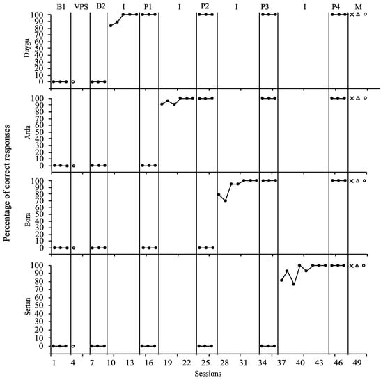 This study conducted daily and complete probe sessions in the same way as the baseline sessions. The daily probe session was designed to evaluate the participant’s current performance level and determine if it was appropriate to conclude the intervention process. These sessions were essential for monitoring the achievement of the target skill’s criterion. Each daily probe session, performed as a single trial after the intervention session, continued until a participant consistently displayed 100% accuracy in the target skills over three consecutive daily probe sessions.