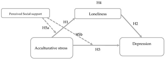 This study aims to explore the following: (a) the potential correlation between acculturative stress and depression among Nigerian international university students, (b) whether loneliness may serve as a mediator in the relationship between acculturative stress and depression, and (c) if the direct impact of acculturative stress, loneliness, and depression would be moderated by perceived social support. Drawing upon an integrated model (refer to Figure 1), this study is structured around the following hypotheses: