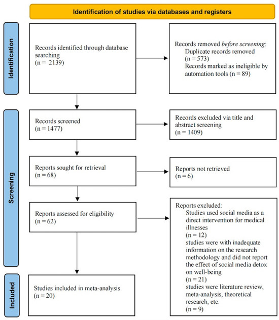 A systematic literature search was conducted on 30 June 2024 across multiple databases, including Web of Science/SSCI, Social Science Database, Springer, PsycINFO, Elsevier SDOL, and Google Scholar. The search utilized comprehensive combinations of keywords related to social media (e.g., social network site, social networking site SNS, online, Facebook, Instagram, Twitter, Myspace, WeChat, TikTok, DouYin, Qzone, and Weibo) detox (e.g., detoxication, negative use, discontinuance, discontinuous use, no-use, limited use, intervention, take a break, abstinence, time out, quitting, unplugged, reduction, and restriction), and well-being (e.g., mental health, life satisfaction, positive and negative affects, emotion, feeling, social support, self-esteem, depression, loneliness, anxiety, envy, and stress). Additionally, in order to avoid missing unpublished gray literature, we consulted the dissertations libraries of universities and academic institutions, such as ProQuest Dissertations and Theses, and gray literature databases, such as OpenGrey and Grey Literature Report. We also reviewed the abstracts of academic conferences and tried to contact relevant authors for unpublished data.