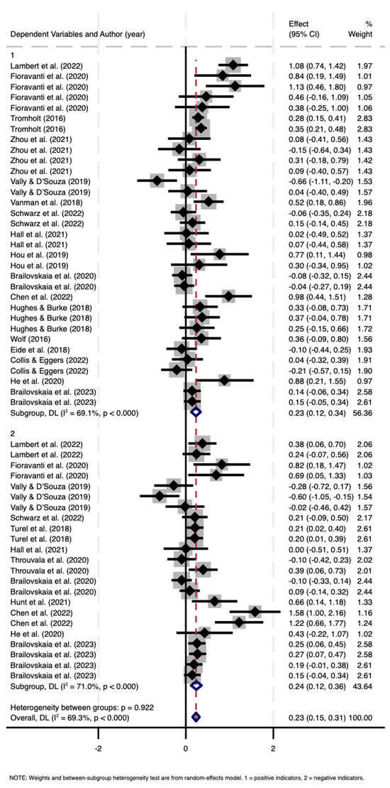 According to Cohen (2013), an effect size 0.2 <= d < 0.5 is considered small, 0.5 <= d < 0.8 is considered medium, and d >= 0.8 is considered large. If SMD demonstrates a positive effect on well-being, the effect size is positive, and if it has a negative effect, the effect size is negative. To maintain consistency in the data, where positive values signify beneficial effects and negative values denote adverse effects, negative indicators were reversed in this study.