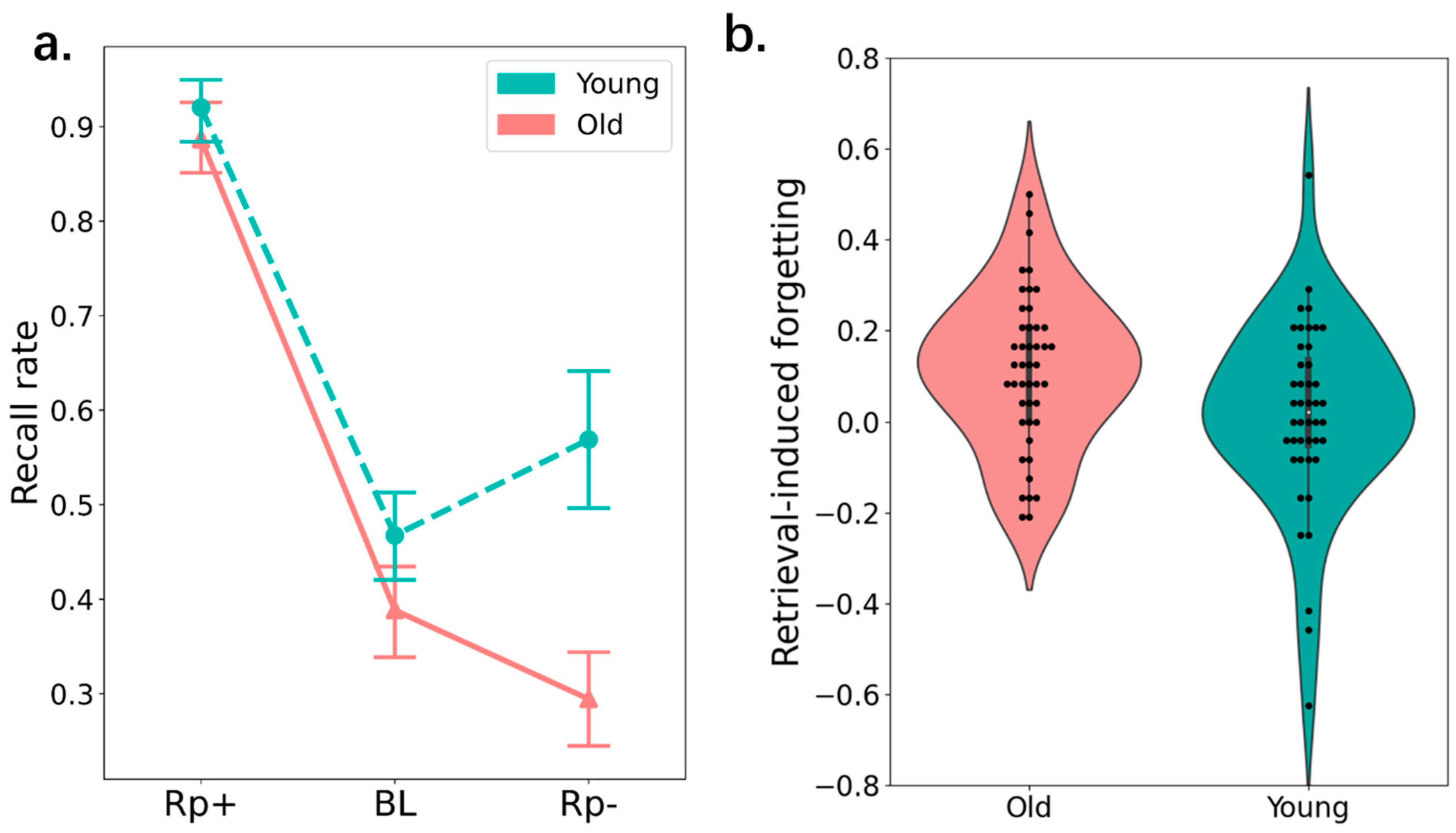2022) theorized that inhibition induced by selective retrieval could impair memory consolidation and lead to permanent forgetting. Lending credence to this hypothesis, the present study showed that such disruption does occur, at least among the older population. Therefore, while numerous studies have suggested that RIF is generally a temporary inhibition process and the memory for Rp− items can become recallable (released from inhibition) after a long delay for young adults, our findings demonstrate that RIF was rather durable for older adults. To our knowledge, the present study is the first to demonstrate that age moderates the duration of RIF.