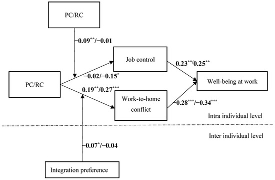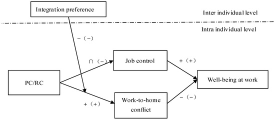 Relative to RC → work-to-home conflict → well-being at work, the PC relationship → work-to-home conflict → well-being at work is more strongly mitigated by individual integration preferences.