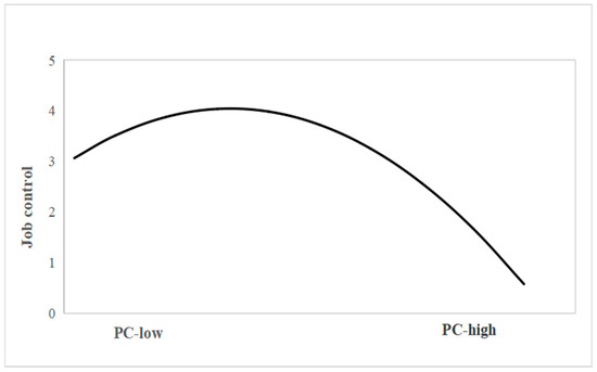 When all control variables were included in the model and controlled for, this study tested the research hypothesis through multi-level path analysis. As shown in Figure 2, the square term of PC had a negative association with job control (β = −0.09, p < 0.01), indicating that PC had an inverted U-shaped effect on job control. Figure 3 shows how the sense of job control changes with the PC. Job control was positively associated with well-being at work (β = 0.23, p < 0.01). The mediating effect value of PC → job control → well-being at work was 0.02; furthermore, the Monte Carlo simulation showed that the 95% confidence interval did not include 0 ([0.002,0.05]), indicating that job control mediates the inverted U-shaped relationship between PC and well-being at work and supporting Hypothesis 1a.