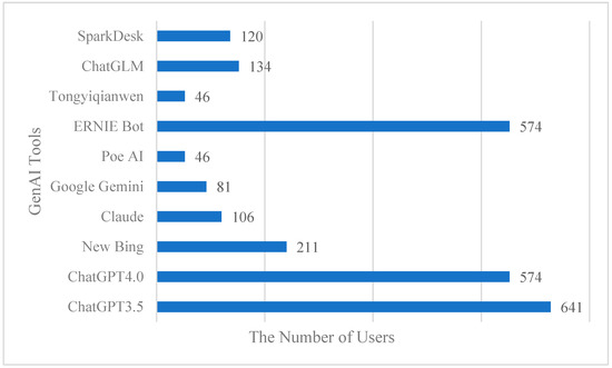 The participants in this study were higher education students. Among the valid responses, 1448 (81.12%) used GenAI tools for their studies and research; 54.80% were female, 45.20% were male; 63.80% were undergraduates, 36.20% were graduates; 58.35% came from non-elite universities, 41.64% came from elite universities1; and 42.30% majored in science, technology, engineering and mathematics, 57.70% majored in humanities and social science. The percentages of the time when students began frequently using electronic products before entering elementary school, during elementary school, during junior school, during high school, and after entering university or beyond were 8.22%, 40.14%, 29.80%, 12.94%, and 8.19%, respectively. Figure 2 shows the GenAI tools which are most commonly used by higher education students in China.