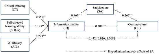 According to Table 2, critical thinking (β = 0.557, p < 0.001), self-directed learning ability (β = 0.195, p < 0.01), and AI literacy (β = 0.273, p < 0.001) are positively and significantly related to information quality. Therefore, H1, H2, and H3 are supported. Meanwhile, information quality is positively and significantly related to satisfaction (β = 0.967, p < 0.001) and intention to continue using GenAI tools (β = 0.302, p < 0.001). In addition, there was a positive correlation between satisfaction and intention to continue using GenAI tools (β = 0.267, p < 0.001). This supports H4, H5, and H6. Furthermore, information quality has a positive impact on continued use through the mediation of satisfaction (β = 0.432, bootstrap 95% [0.926, 1.008]), which supports H7. The results are summarized in Figure 3.