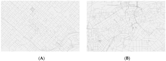 Generated using the OpenStreetMap, which is available under the Open Data Commons Open Database License by the OpenStreetMap Foundation. (A) An example of a structured environment in the United States; (B) an example of an unstructured environment in Denmark.