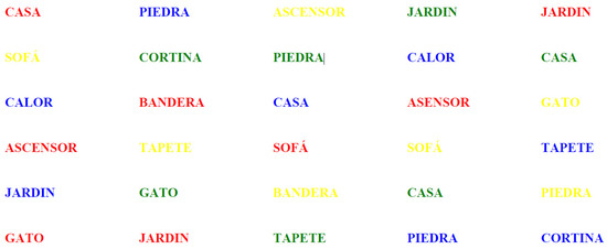 - Stroop, J. R. (1935). Studies of interference in serial verbal reactions. Journal of Experimental Psychology, 18(6), 643–662. [Google Scholar] [CrossRef]