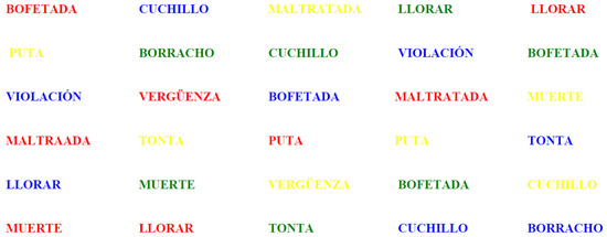 Figure 1, Figure 2 and Figure 3 correspond to excerpts from the Emotional Stroop Test for the identification of PTSD in women victims of intimate partner violence (IPV). The initial sheet showcases ten neutral words printed in blue, yellow, green, and red ink (Figure 1).