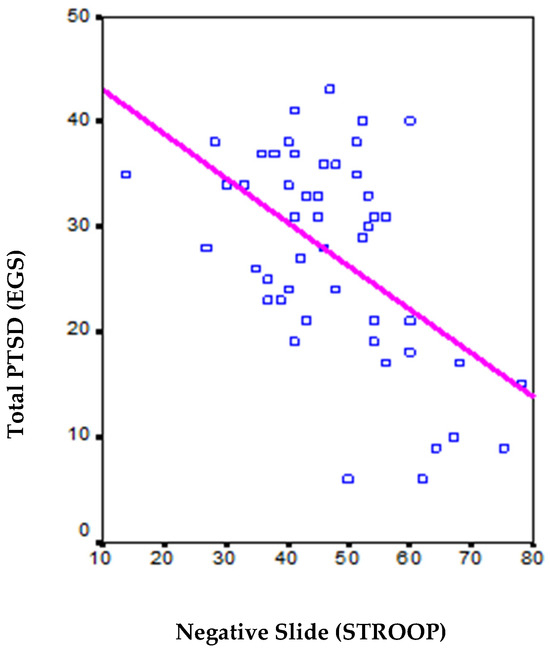 Ultimately, a Pearson Correlation test was conducted between the scores acquired from the negative word sheet of the Emotional Stroop Test for detecting PTSD in women victims of domestic violence and the scores derived from the Post-Traumatic Stress Disorder Symptom Severity Scale (EGS) applied to the clinical population. The analysis revealed a correlation coefficient of −0.528, with a significance level of p = 0.000.