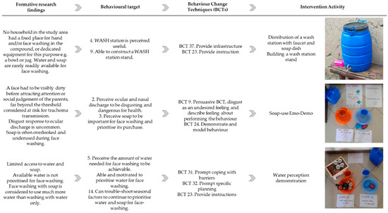 Table 1 presents an overview of the insights from the formative research and preliminary studies, illustrating how findings were mapped to the RANAS behavioural factors. Given that face washing was typically limited to the early morning, rarely involved soap, and was unsupervised for young children (who are key in trachoma transmission), the target behaviour was defined as faces (and hands) of the whole family (particularly pre-school children) to be thoroughly washed with soap three times a day: morning after waking, before lunch, and before the evening meal. This definition prioritised pre-school children, increased washing frequency, and emphasised soap use and caregiver supervision for effective discharge removal.