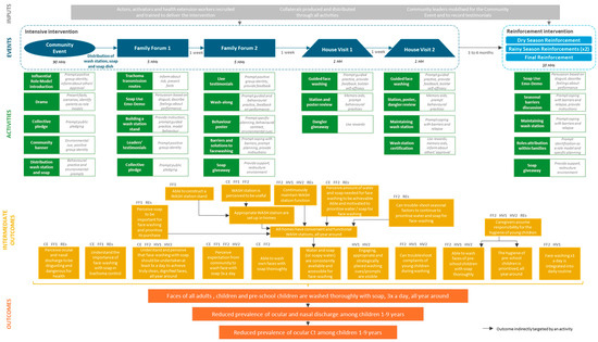 The intervention’s final Theory of Change is presented in Figure 3. The schematic illustrates how intervention activities and associated BCTs are employed to modify specific behavioural targets (intermediate outcomes) which are hypothesised to increase face washing with soap (outcome). This increased face washing, in turn, is expected to reduce oculo-nasal discharge on children’s faces, thereby contributing to a decrease in trachoma transmission within the community.