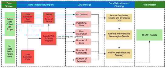 - Data Verification and Cleaning: After data collection, a comprehensive cleaning process was conducted. First, duplicate tweets, null data, and obviously erroneous data were removed; second, tweets with meaningless or irrelevant content—such as those containing only images or emojis—were filtered out; finally, the consistency and accuracy of the data were verified. After cleaning, the final dataset consisted of 194,151 valid tweets from 47,090 users.