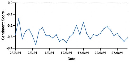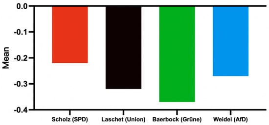 From a temporal perspective (Figure 5), public sentiment remained negative throughout the 2021 German federal election period. The mean sentiment score was always below 0, fluctuating between −0.37 and −0.14. Although there were certain ups and downs, the overall trend did not deviate from the negative range.