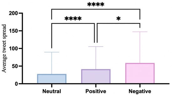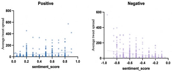 To explore the impact of emotion on the spread of tweets, this study conducts analyses from the following three aspects: First, the mean spread of the three groups of positive, neutral, and negative tweets is compared. A Kruskal–Wallis test is applied to evaluate whether there are significant differences in dissemination among the three groups. Secondly, the correlation between the sentiment intensity and the spread is analyzed using Spearman’s rank correlation test. This step assesses the extent to which sentiment intensity influences spread. Finally, a linear regression analysis was used to compare the mean spread of tweets with negative and positive emotions to test whether negative emotions were more likely to spread than positive emotions.