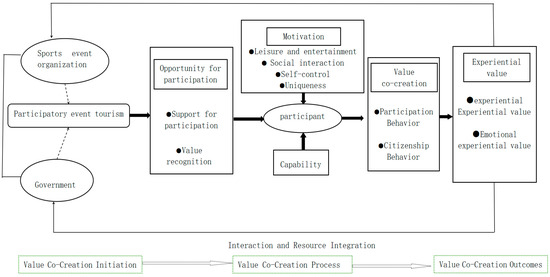 The value co-creation model in participatory sports event tourism can be conceptualized as a complex system in which event organizers, government agencies, and event tourists interact and collaborate, both directly and indirectly, to optimize resource utilization, exchange, and integration. The value co-creation behavior of event tourists results from the combined influence of external environmental drivers and intrinsic motivations. Participation motivation serves as the primary catalyst and internal force driving event tourists’ value co-creation behaviors. Key drivers, such as the need for leisure and entertainment, self-control, social interaction, and uniqueness, transition the value creation process from a passive observation state to an active engagement state. Participation ability refers to a relatively stable internal characteristic of event tourists, reflecting the alignment between their economic, physical, and knowledge-based capabilities and their involvement in value co-creation activities. This ability indicates the goals and outcomes they are likely to achieve during the co-creation process. Participation opportunity is defined by event tourists’ awareness of their current environment, encompassing various social, economic, cultural, and policy factors. This awareness arises from the interaction and collaboration between government entities and event organizers, ultimately providing external support for value co-creation. This support is considered as favorable components derived from the external environment, which stimulate event tourists’ co-creation behaviors.